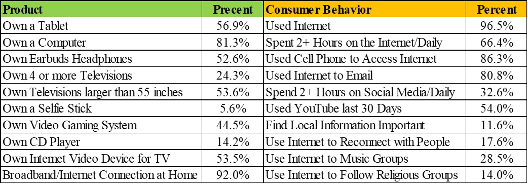 The “Electronic and Internet Market Potential” concept can be used to assess how much more or less Elgin’s population might use and spend compared to national average in hundreds of categories. In the U.S., the Electronics Market is estimated to be between $200-$300 billion. Elgin’s excellent market potential lies in the fact that we have a solid customer base, a diverse demographic with specific needs, a growing economy, increasing salaries, and an increased need for services and products. Anyone interested in knowing the market potential for a specific category before they think about starting a new business, should spend some time gathering additional data and conducting a trade-area market analysis.